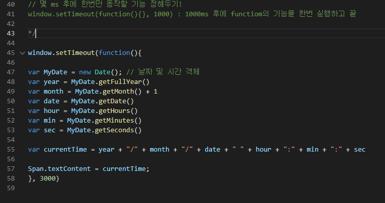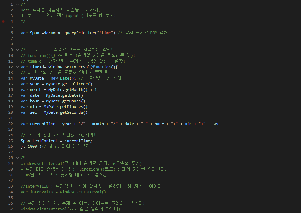 이 프로그램에서는 Date 객체를 초기화해서 변수 now에 대입하고 있다. new는 객체를 초기화하기 위한 키워드이다. Date 객체를 포함한 몇몇 내장 객체를 new를 사용해서 초기화한 후 사용해야 한다.