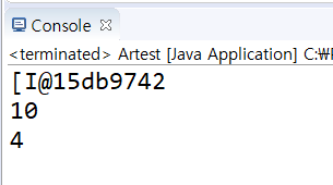 [I@15db9742 -> I:Int형, @: 구분점, 15db9742: 배열이 들어있는 주소값을 의미한다.